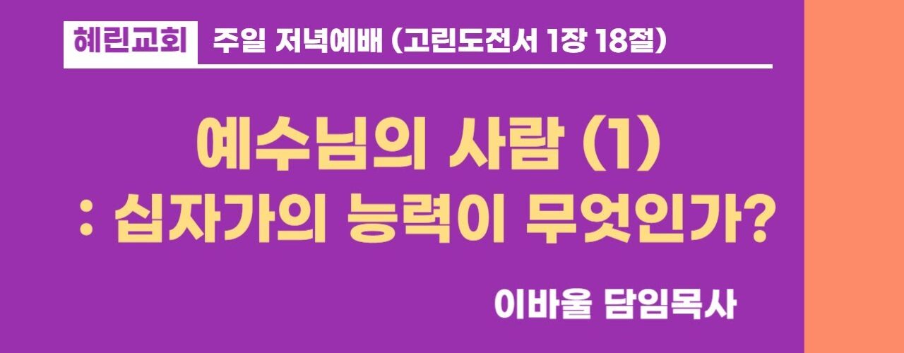 Previous 저녁예배 / 이바울 담임목사 / 예수님의 사람 (2) Next 저녁예배 / 이바울 담임목사 / 인간 관계 속에서 하나님 나라 세워가기 (15) 저녁예배설교 저녁예배 / 이바울 담임목사 / 예수님의 사람 (1) 3개월 ago Watch LaterRemove Cinema Mode FacebookXEmail 혜린교회 / 2025.08.24 / 주일 저녁 / 고전 1:18 / 예수님의 사람 (1) : 십자가의 능력이 무엇인가? / 이바울 목사 저녁예배설교 You may also like Video 저녁예배설교 저녁예배 / 이바울 담임목사 / 예수님의 사람 (10) 1주 ago Video 저녁예배설교 저녁예배 / 이바울 담임목사 / 예수님의 사람 (9) 3주 ago Video 저녁예배설교 저녁예배 / 이바울 담임목사 / 예수님의 사람 (8) 1개월 ago Latest videos 혜린교회 Eze37:5 찬양단 [24.12.05] 1주 ago 혜린교회 중고등부 박남숙선생님 반 특송 [은혜] 1주 ago 혜린교회 혜린TEENS 찬양단 [25.12.05] 1주 ago
