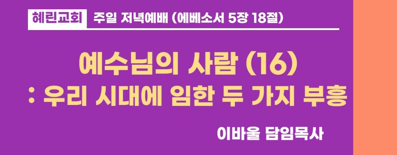 Next 저녁예배 / 이바울 담임목사 / 예수님의 사람 (15) 저녁예배설교 저녁예배 / 이바울 담임목사 / 예수님의 사람 (16) 15시간 ago Watch LaterRemove Cinema Mode FacebookXEmail 혜린교회 / 2026.02.01 / 주일 저녁 / 엡 5:18 / 예수님의 사람(16): 우리 시대에 임한 두 가지 부흥 / 이바울 목사 저녁예배설교 You may also like Video 저녁예배설교 저녁예배 / 이바울 담임목사 / 예수님의 사람 (15) 2주 ago Video 저녁예배설교 저녁예배 / 이바울 담임목사 / 예수님의 사람 (13) 2개월 ago Video 저녁예배설교 저녁예배 / 이바울 담임목사 / 예수님의 사람 (12) 2개월 ago Latest videos 혜린교회 Eze37:5 찬양단 [26.02.01] 2일 ago 혜린교회 이시아, 황진유 학생 특송 [세상에서 가장 귀한 이야기] 2일 ago 혜린교회 혜린TEENS 찬양단 [26.02.01] 2일 ago