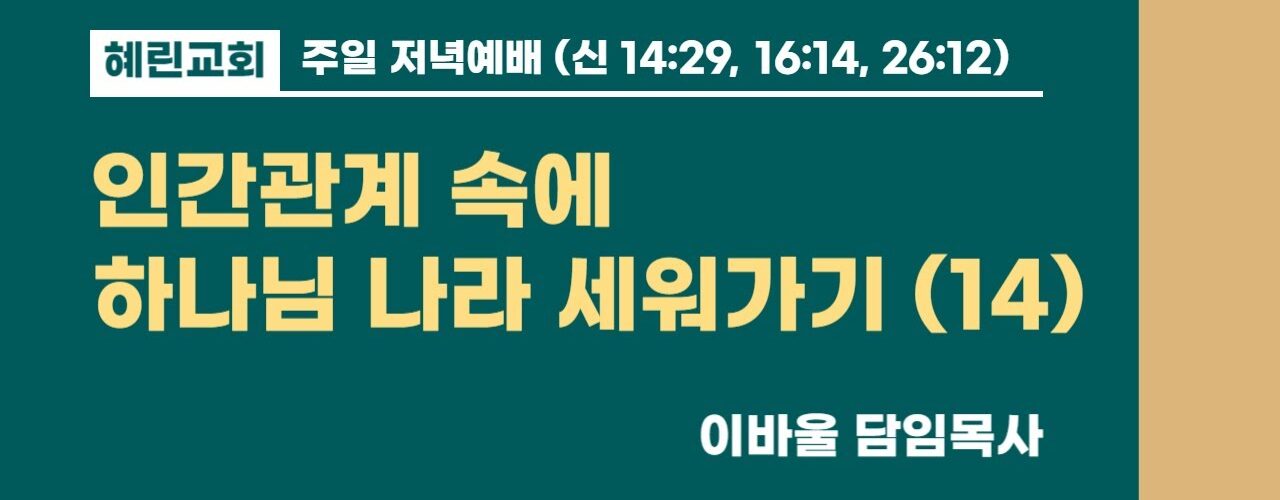 Previous 저녁예배 / 이바울 담임목사 / 인간 관계 속에서 하나님 나라 세워가기 (15) Next 저녁예배 / 이바울 담임목사 / 인간관계 속에 하나님 나라 세워가기 (13) 저녁예배설교 저녁예배 / 이바울 담임목사 / 인간관계 속에 하나님 나라 세워가기 (14) 4개월 ago Watch LaterRemove Cinema Mode FacebookXEmail 혜린교회 / 2025.08.10 / 주일 저녁 / 신 14:29, 신 16:14, 신 26:12 /인간관계 속에 하나님 나라 세워가기(14) / 이바울목사 저녁예배설교 You may also like Video 저녁예배설교 저녁예배 / 이바울 담임목사 / 예수님의 사람 (10) 1주 ago Video 저녁예배설교 저녁예배 / 이바울 담임목사 / 예수님의 사람 (9) 3주 ago Video 저녁예배설교 저녁예배 / 이바울 담임목사 / 예수님의 사람 (8) 1개월 ago Latest videos 혜린교회 Eze37:5 찬양단 [24.12.05] 1주 ago 혜린교회 중고등부 박남숙선생님 반 특송 [은혜] 1주 ago 혜린교회 혜린TEENS 찬양단 [25.12.05] 1주 ago