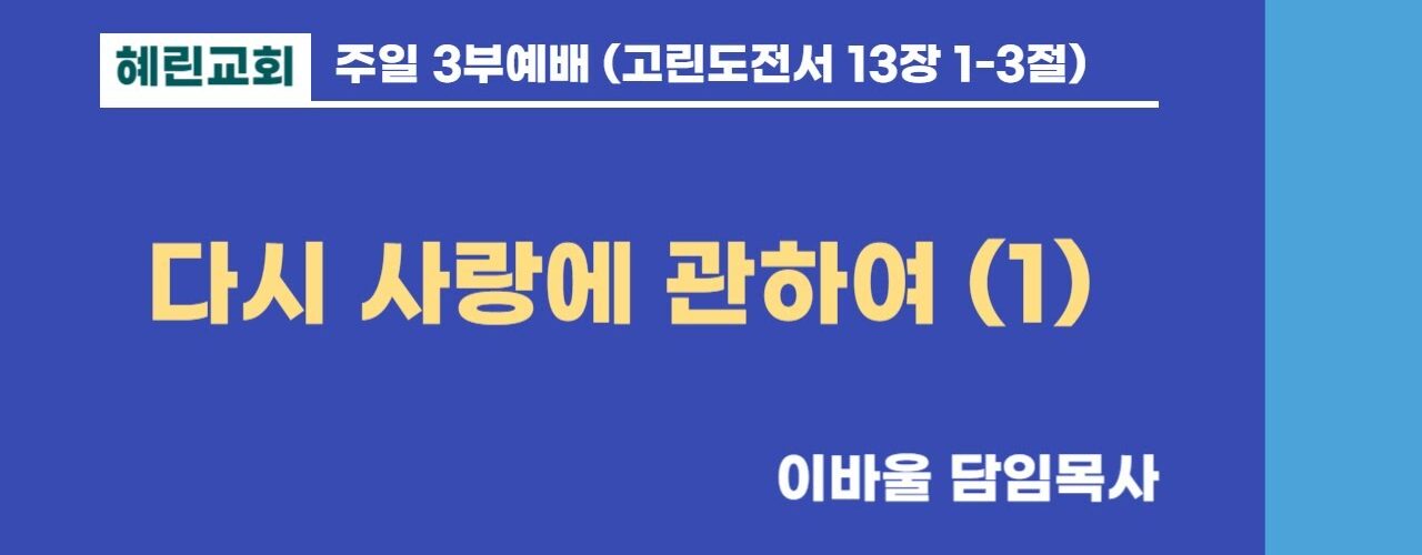 Previous 3부예배 / 이바울 담임목사 / 다시 사랑에 관하여 (2) Next 3부예배 / 이바울 담임목사 / 성령이 임하시다 주일예배설교 3부예배 / 이바울 담임목사 / 다시 사랑에 관하여 (1) 7개월 ago Watch LaterRemove Cinema Mode FacebookXEmail 주일예배설교 You may also like Video 주일예배설교 3부예배 / 이바울 담임목사 / 다시 사랑에 관하여 (16) 3주 ago Video 주일예배설교 3부예배 / 이바울 담임목사 / 다시 사랑에 관하여 (15) 3주 ago Video 주일예배설교 3부예배 / 이바울 담임목사 / 사랑은 모든것을 믿습니다 4주 ago Latest videos 저녁예배 / 이바울 담임목사 / 예수님의 사람 (16) 1일 ago 혜린교회 Eze37:5 찬양단 [26.02.01] 2일 ago 혜린교회 이시아, 황진유 학생 특송 [세상에서 가장 귀한 이야기] 2일 ago