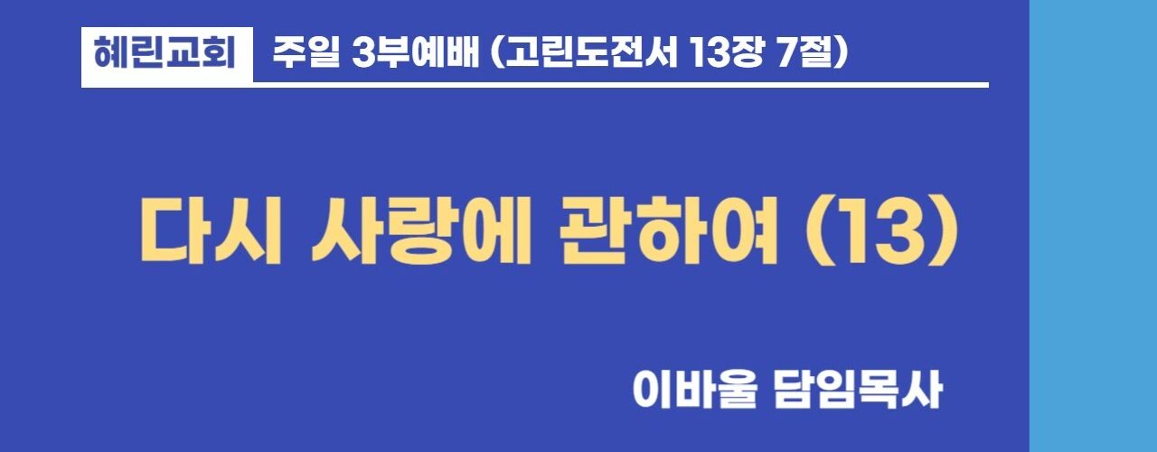 Next 3부예배 / 이바울 담임목사 / 다시 사랑에 관하여 (12) 주일예배설교 3부예배 / 이바울 담임목사 / 다시 사랑에 관하여 (13) 18시간 ago Watch LaterRemove Cinema Mode FacebookXEmail 혜린교회 / 2025.12.28 / 주일 3부 / 고전 13:7 / 다시 사랑에 관하여(13) / 이바울 목사 주일예배설교 You may also like Video 주일예배설교 3부예배 / 이바울 담임목사 / 다시 사랑에 관하여 (12) 2주 ago Video 주일예배설교 3부예배 / 이바울 담임목사 / 다시 사랑에 관하여 (11) 3주 ago Video 주일예배설교 3부예배 / 이바울 담임목사 / 다시 사랑에 관하여 (10) 4주 ago Latest videos 송구영신예배 / 이바울 담임목사 / 원수 사랑 17시간 ago Faith Archive Ep.44 – 최영수 집사 (Hyerin Church) 3일 ago Faith Archive Ep.43 – 김교봉 집사 (Hyerin Church) 4일 ago