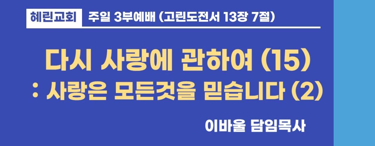 혜린교회 / 2026.01.11 / 주일 3부 / 고전 13:7 / 다시 사랑에 관하여(15) / 이바울 목사