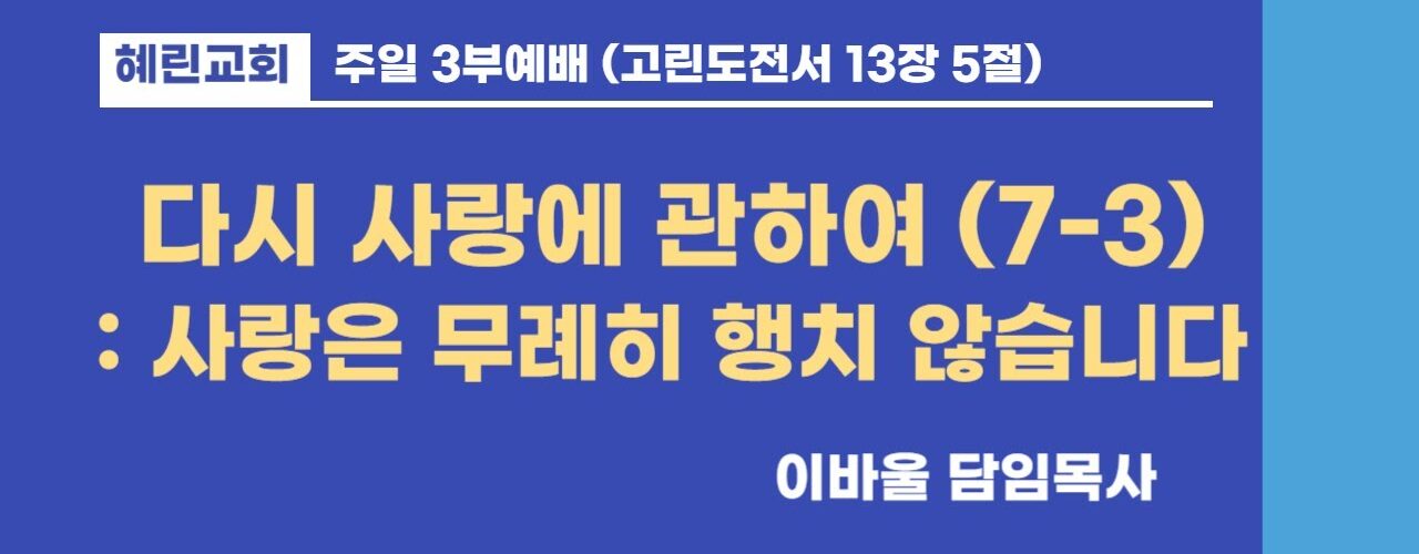 Previous 3부예배 / 이바울 담임목사 / 다시 사랑에 관하여 (8) Next 3부예배 / 이바울 담임목사 / 다시 사랑에 관하여 (7-2) 주일예배설교 3부예배 / 이바울 담임목사 / 다시 사랑에 관하여 (7-3) 3개월 ago Watch LaterRemove Cinema Mode FacebookXEmail 주일예배설교 You may also like Video 주일예배설교 3부예배 / 이바울 담임목사 / 다시 사랑에 관하여 (10) 1주 ago Video 주일예배설교 3부예배 / 이바울 담임목사 / 그리스도 중심적 감사 4주 ago Video 주일예배설교 3부예배 / 이바울 담임목사 / 감사, 성도의 깨어 있음의 증거! 1개월 ago Latest videos 혜린교회 Eze37:5 찬양단 [24.12.05] 1주 ago 혜린교회 중고등부 박남숙선생님 반 특송 [은혜] 1주 ago 혜린교회 혜린TEENS 찬양단 [25.12.05] 1주 ago