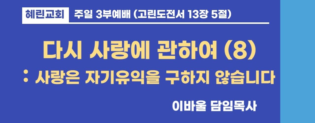 Previous 4부예배 / 이바울 담임목사 / #4. 이 시대가 하나님을 믿지 못하는 이유들 Next 3부예배 / 이바울 담임목사 / 다시 사랑에 관하여 (7-3) 주일예배설교 3부예배 / 이바울 담임목사 / 다시 사랑에 관하여 (8) 3개월 ago Watch LaterRemove Cinema Mode FacebookXEmail 혜린교회 / 2025.09.14 / 주일 3부 / 고전 13:5 / 다시 사랑에 관하여(8) / 이바울 목사 주일예배설교 You may also like Video 주일예배설교 3부예배 / 이바울 담임목사 / 다시 사랑에 관하여 (10) 1주 ago Video 주일예배설교 3부예배 / 이바울 담임목사 / 그리스도 중심적 감사 4주 ago Video 주일예배설교 3부예배 / 이바울 담임목사 / 감사, 성도의 깨어 있음의 증거! 1개월 ago Latest videos 혜린교회 Eze37:5 찬양단 [24.12.05] 1주 ago 혜린교회 중고등부 박남숙선생님 반 특송 [은혜] 1주 ago 혜린교회 혜린TEENS 찬양단 [25.12.05] 1주 ago